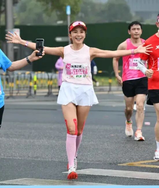 朱迅在完成马拉松后,虽然疲惫,但她的美丽依然如旧,整体粉色搭配看起来更显年轻。