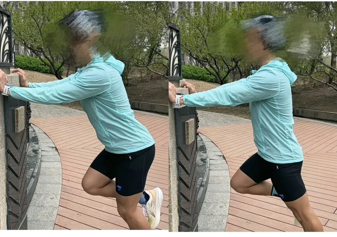 可以在保持正确的跑姿双手撑墙做一个送髋练习,髋尽量往前,做交换腿动作,模拟跑步时的跑步动作。交换腿时,提腿时将你的髋部往前送出去,感受送髋的感觉。