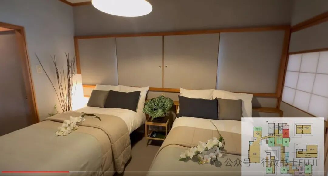 ☝厨房旁边是间卧室。卧室里摆了两张床,不过这床并非前房主的残留物,而是房产公司类似样板房的操作给前来看房的客户找感觉用的,这两张是从家具店租来的,到时还要还回去。