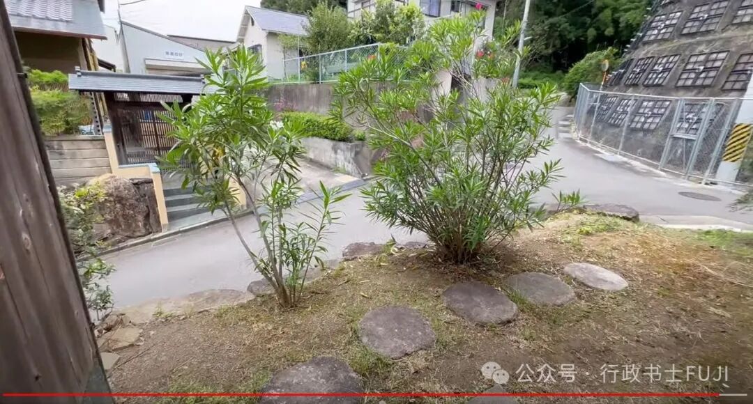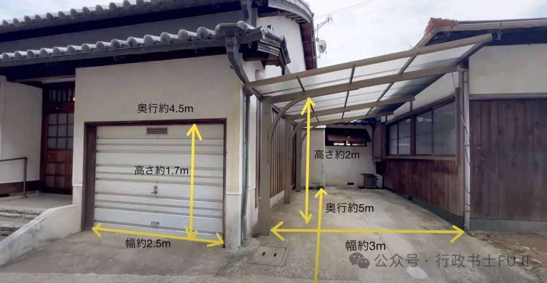 ☝房子的正门在4m宽道路一向。这是停车场,目前可停2辆车。带卷帘门的车库只有2.5米宽,只能停那种日式的家庭小车,但旁边的阳光车棚型停车场有3m宽,大车应该没有问题。如果觉得车位不够,挨着阳光车棚旁边的其实是间杂物间,完全可以改成停车场。