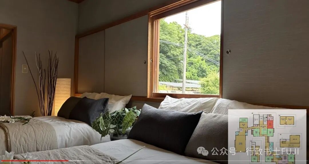 ☝床户的背景墙其实是日式拉窗。拉开后,郁郁葱葱的树木很养眼。