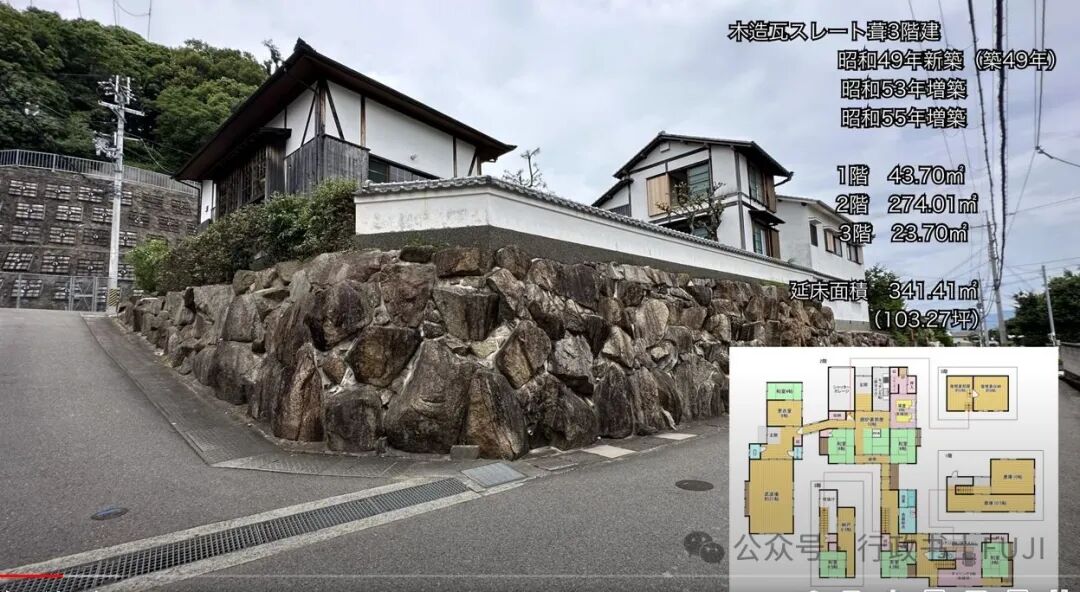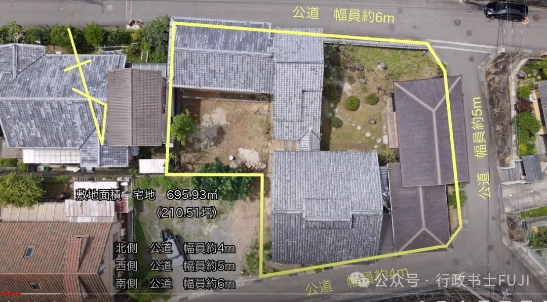 ☝土地面积695.93平米,邻接三方道路,分别为4m、5m和6m。这座古民宅的位于闲静的住宅区之中。并非农宅。原建造于1974年,但后于1978年和1980年分别增建,房屋总面积为341.41平米。