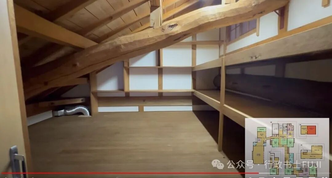 ☝储藏室连着一间储藏室。这里其实是围炉里这座建筑的房顶部分。因为屋顶是斜的,所以层高很低。放放杂物完全没有问题。只能说能利用的空间都利用上了。