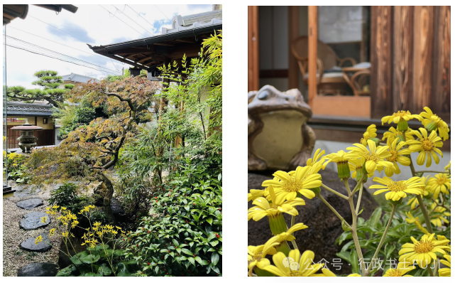 ☝庭园入口处,别致典雅的石灯笼旁有尊金蟾蜍静静地望着你,不仅有风水方面的寓意,也不失童趣之心。