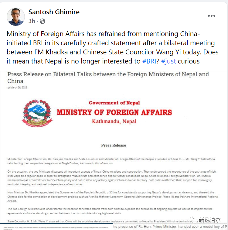 一位名叫桑托斯的记者在推特上发文,质问:为什么尼外交部26日发布的新闻稿中,对于“一带一路”一字不提?难道尼泊尔已经对“一带一路”失去了兴趣?