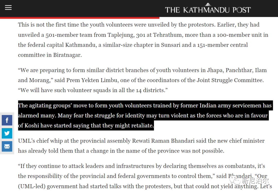 (黑体部分的大意:反对柯西这个名字的群体组成了青年志愿者,这些志愿者由此前在印度军队服役的人员进行培训,这引了发许多人的警觉。许多人担心,争取身份的抗争会演变为暴力,因为那些支持柯西这个名字的人们已经宣布,他们将进行报复)