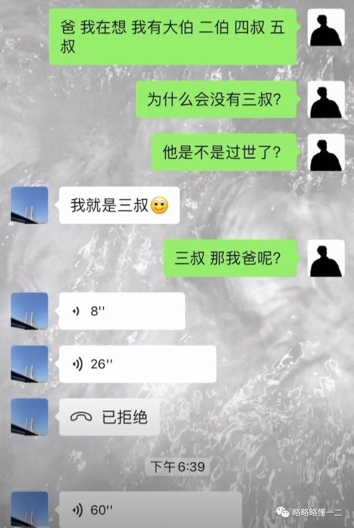 后面一条消息的信息量就比较巨大了,你直接称呼你爸爸三叔,还问你爸爸“我爸呢?”你说你是不是知道了什么秘密。