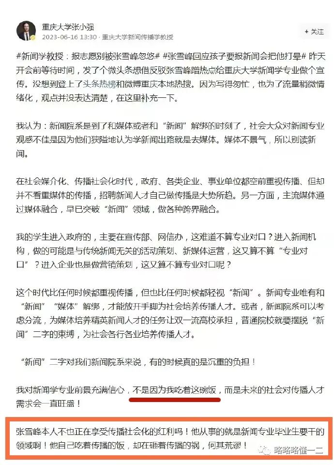 这一次,是重庆大学的新闻传播学教授张小强发文怒怼张雪峰:自己吃着传播的饭,却在砸着传播的锅,何其荒谬!
