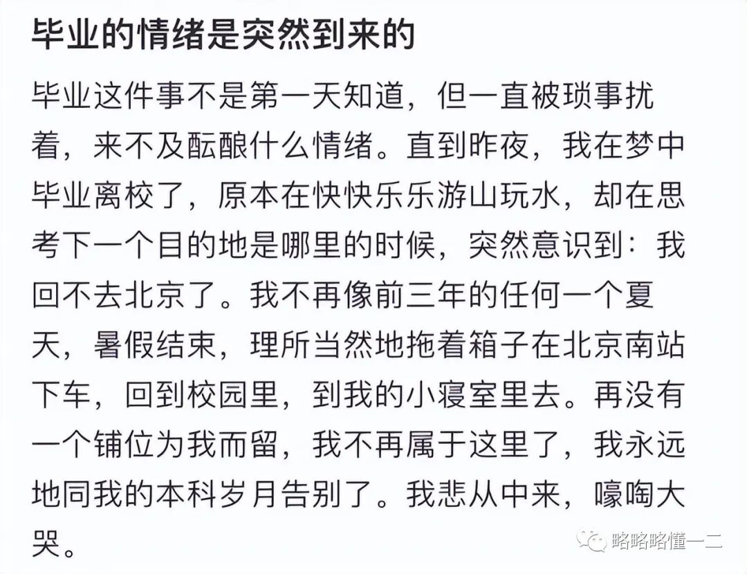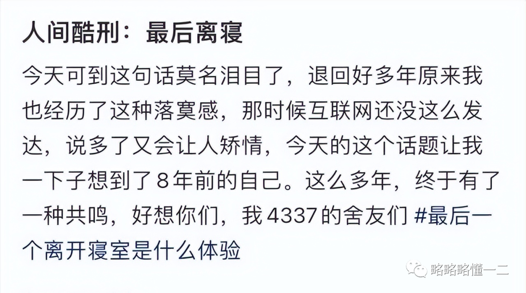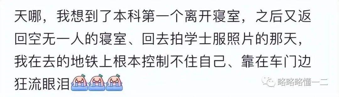 有学姐自豪的分享:大学本科和研究生毕业时都是最后一个离寝,当着她们的面一滴眼泪都没有流。然后在关上宿舍门,走出校园的时候嚎啕大哭。