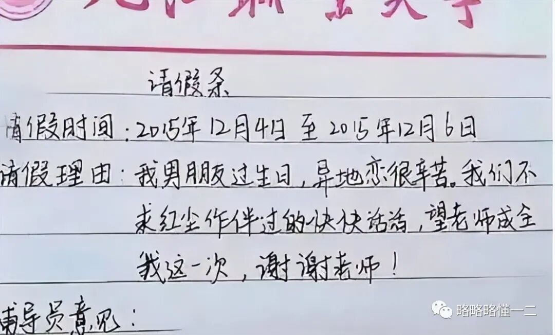 学生请假需要一个合适的理由,要么事假要么病假要么丧假,当我看到00后大学生的请假条时,我感觉90后的我老了!不是代沟,还是鸿沟。