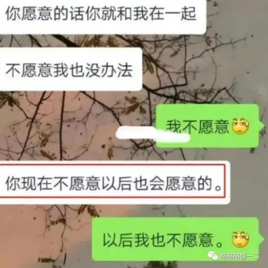 还有“霸道总裁”风格的聊天记录,和女生说你愿意的话就和我在一起,女生都说了不愿意,结果精彩的来了,继续说你现在不愿意,以后也会愿意的,“去油”达人的女生一点活口没给留,说以后也不会愿意。