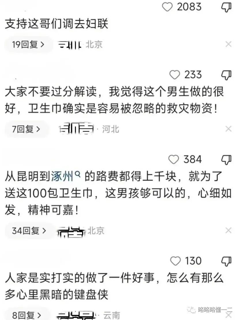 但一名来自昆明理工大学的大三学生却买了100包卫生巾支援了涿州,瞬间引起热议,网友纷纷表示考虑得非常周到。