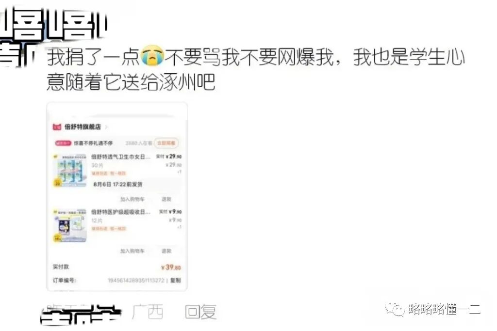 还有网友晒了购买记录,但是配文说得让人心疼,这名同学说自己也是学生,自己捐了一点,不要骂他(她)网暴他(她),把心意送给涿州。