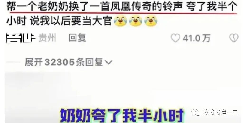 还有帮助老奶奶换铃声的,可能就几分钟的事,但大学生却得到了老奶奶半个小时的夸奖,看得出来大学生心情是愉悦的。