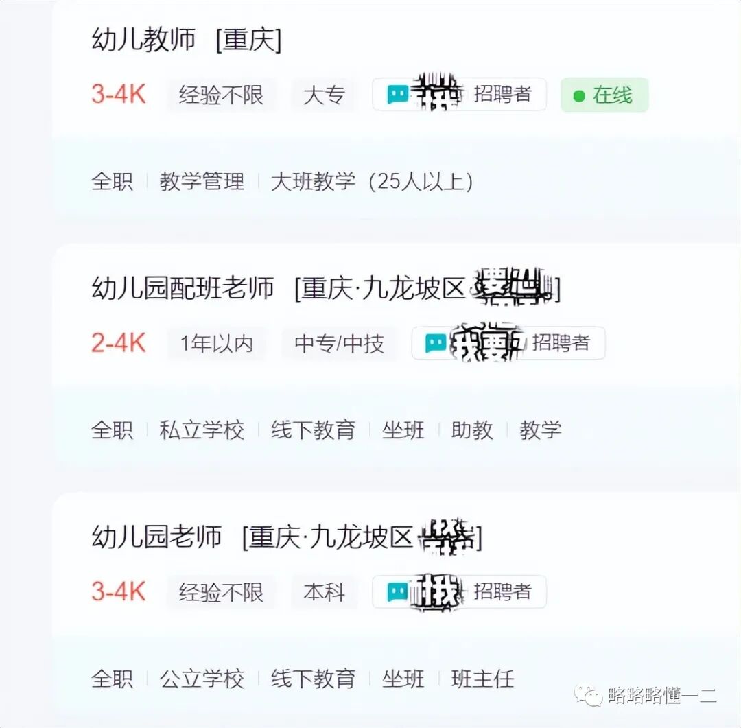 搜索幼儿园教师后的首页,找过工作的人都应该知道吧!说是3-4K,其实就看左边就行了。