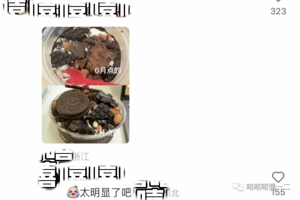 原来员工给大家做冷饮时,显得多就可以了,上面也就是平顶的,用奥利奥饼干才感觉显得多一些,到大学生上手后直接就是“冒尖”。