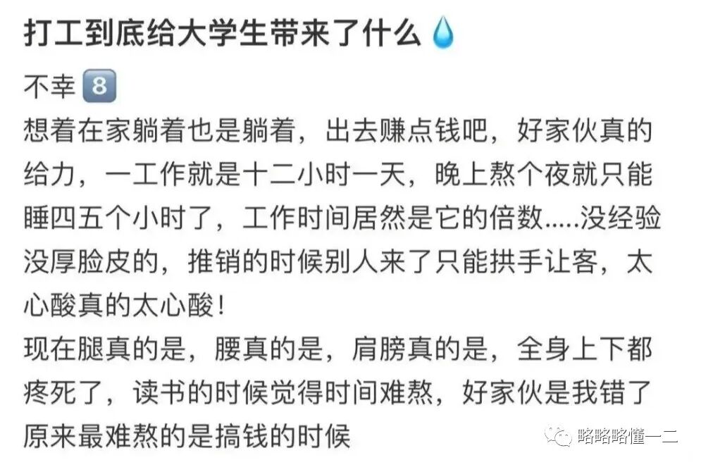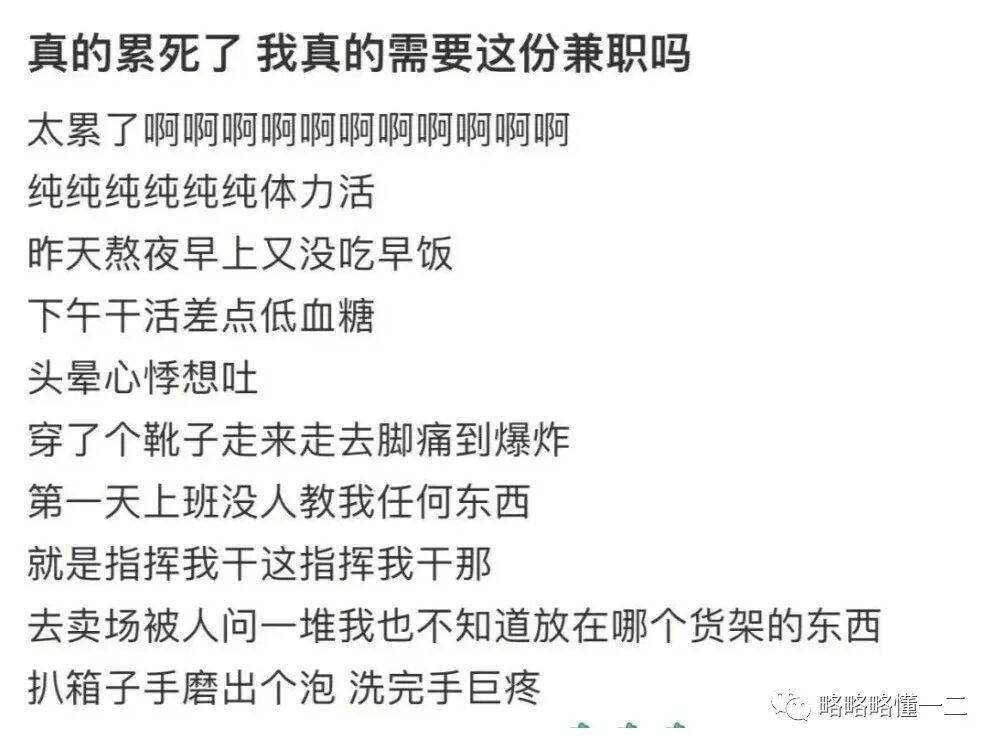 比如大学生作为暑期临时工时受到老板的欺负,不尊重大学生,被人指挥干这个干那个,被人问一堆不知道放哪个货架子上的东西,一天下来手上都是泡,听着就比较疼。