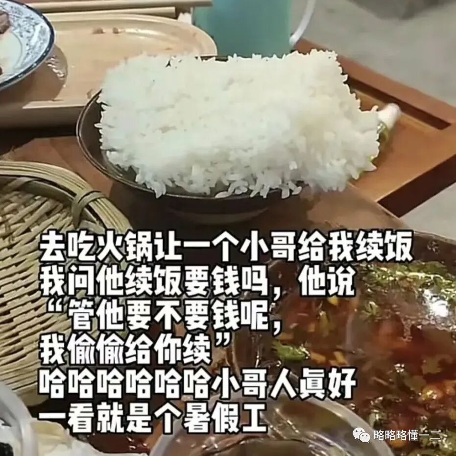大学生“摆烂式”打工真的让顾客很喜欢,当网友去饭店吃火锅时,想让一个小哥帮忙续饭,问续饭需要钱吗?结果小哥说管他要不要钱?我给你偷偷续。
