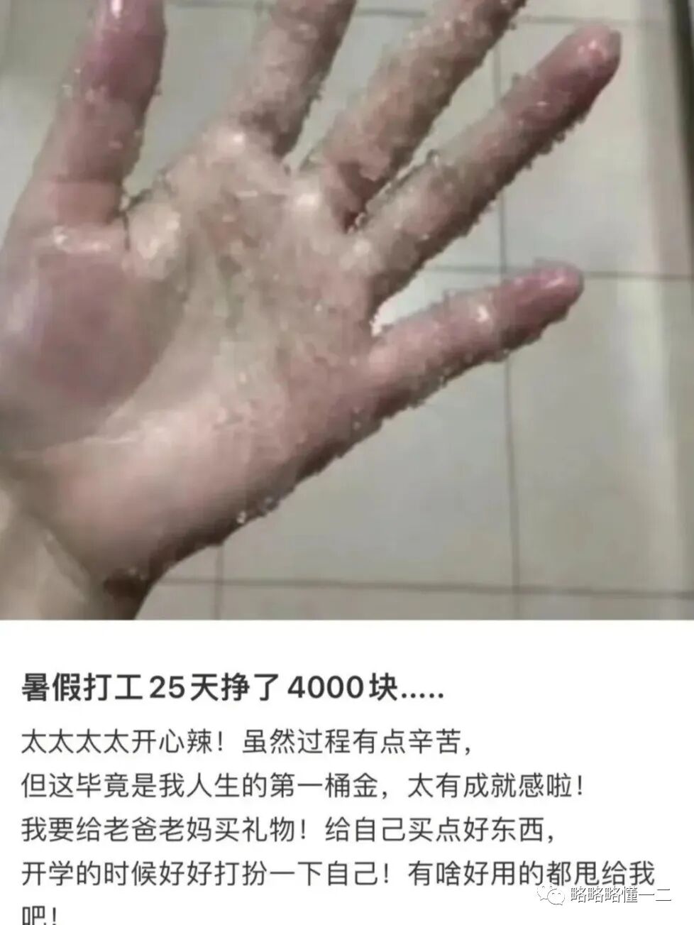 还有大学生在网上分享自己暑期打工的经历,工作了25天挣了4000块钱,这名同学非常兴奋,说这是他人生的第一桶金,还比较有孝心,想着给父母买礼物,给自己买好吃的,满满的成就感。