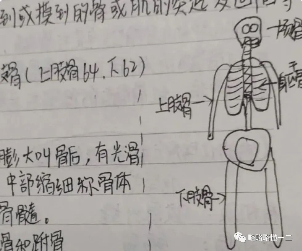 还有同学笔记写得挺认真,知识点也很全面,可旁边这个图配得真有一种不太专业的感觉,好像那幼儿园的简笔画,但已经形似了,看得出来画的是人体骨骼。