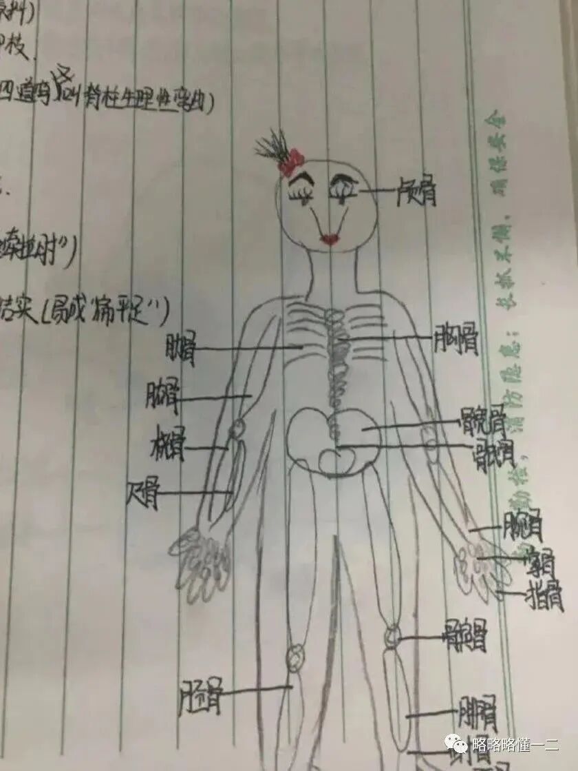 这名画的骨骼图竟然有点可爱,这名同学给骨骼画上了口红,眉毛还有睫毛,甚至还给它画了头发,靠这些反差,让这名同学的笔记脱颖而出了。