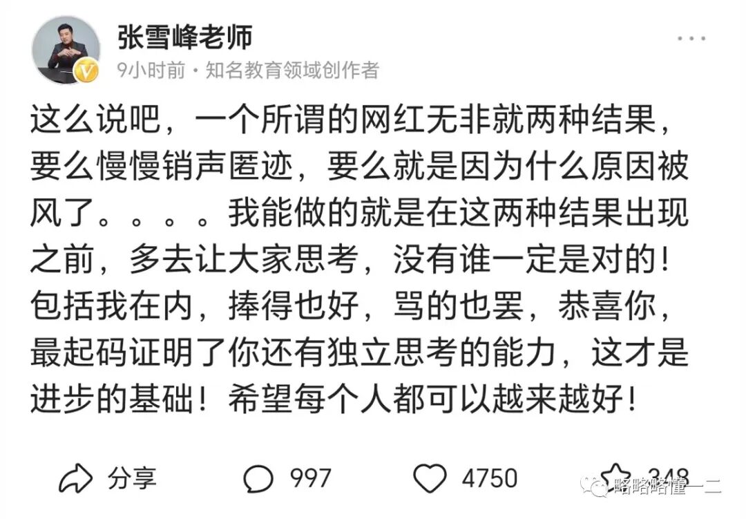 可其他文科专业的人,尤其是厉害人物就忍不了了。一时间一语激起千层浪,对于张雪峰的言论,还有不少知名大学的教授出来反驳,张雪峰成为风口浪尖的人物。