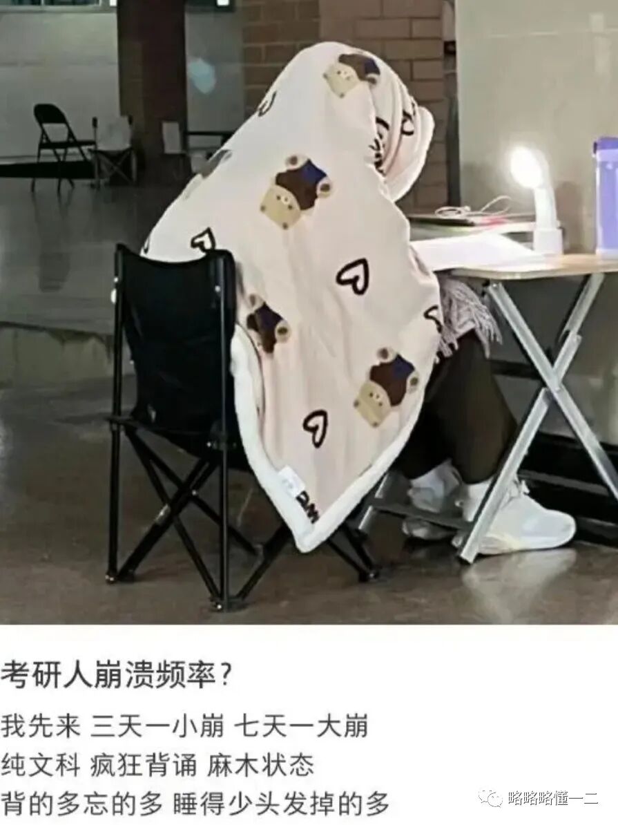 考研人压力有多大,情绪崩溃的频率就有多快,考研人说自己的情绪三天一小崩,七天一大崩,文科生疯狂背诵,背得多忘得多,睡得少头发掉的多,太心疼考研人了。