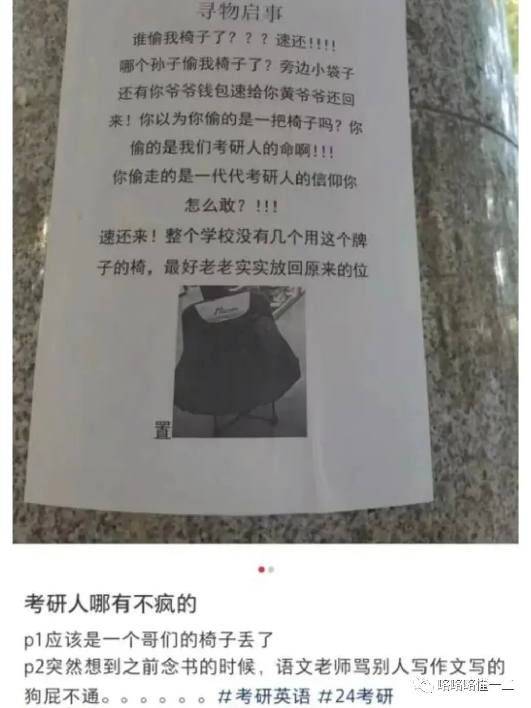 这个时候备考的考研人,他们是脆弱的,可能平时椅子丢了也就丢了,但这个时候椅子被偷,大概就是所谓的压倒骆驼的最后一根稻草,考研人不能接受,直接张贴告示。