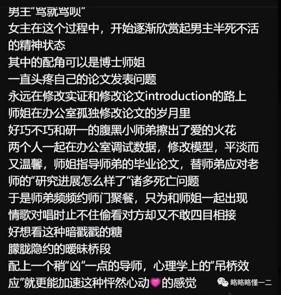 大家可以想象一下都有哪些情节?比如女主被导师分配了高深的课题,查不完的文献,开不完的组会,男主也是同样的命运。