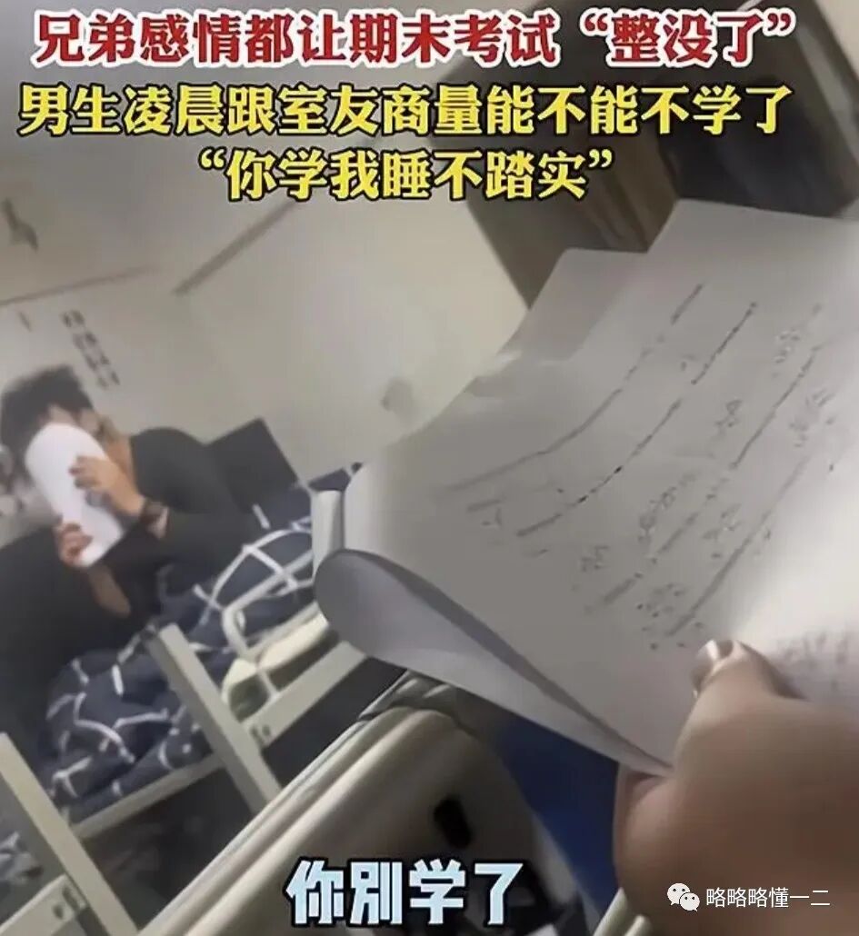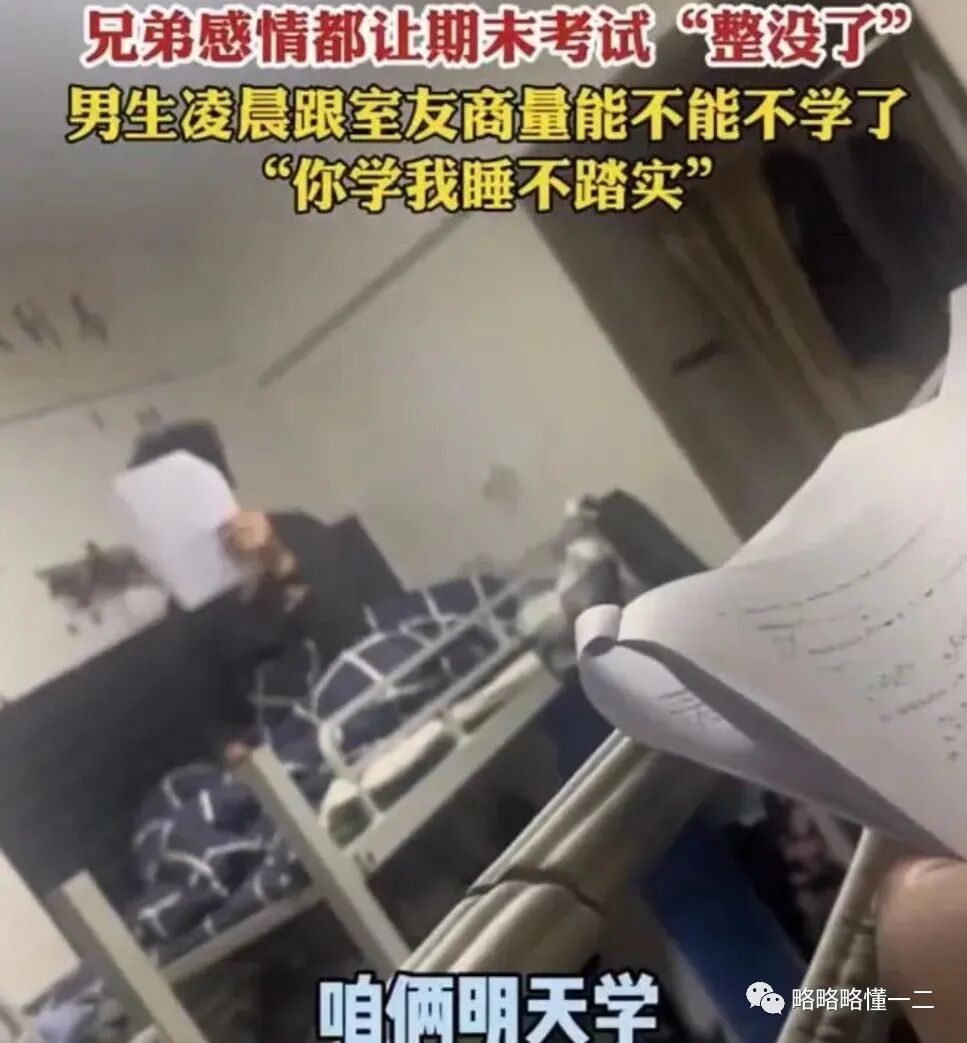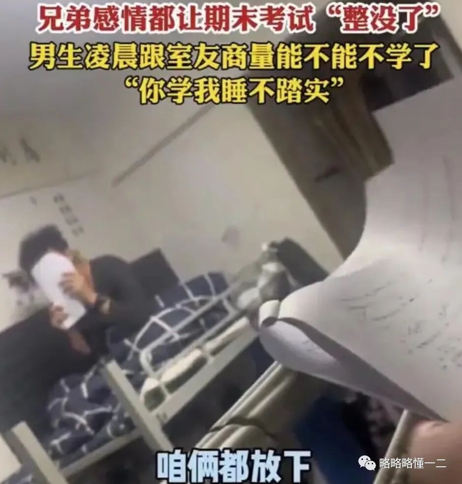 这两名大学生也在熬夜复习,已经学习到凌晨了,其中一名男生熬不住了,就对另外一名男生说:“你别学了,咱俩都放下,明天再学”,结果对方并没有同意他的提议,室友还说了一句:“你睡你的就是了”。