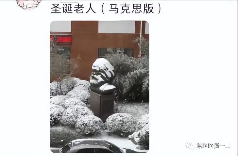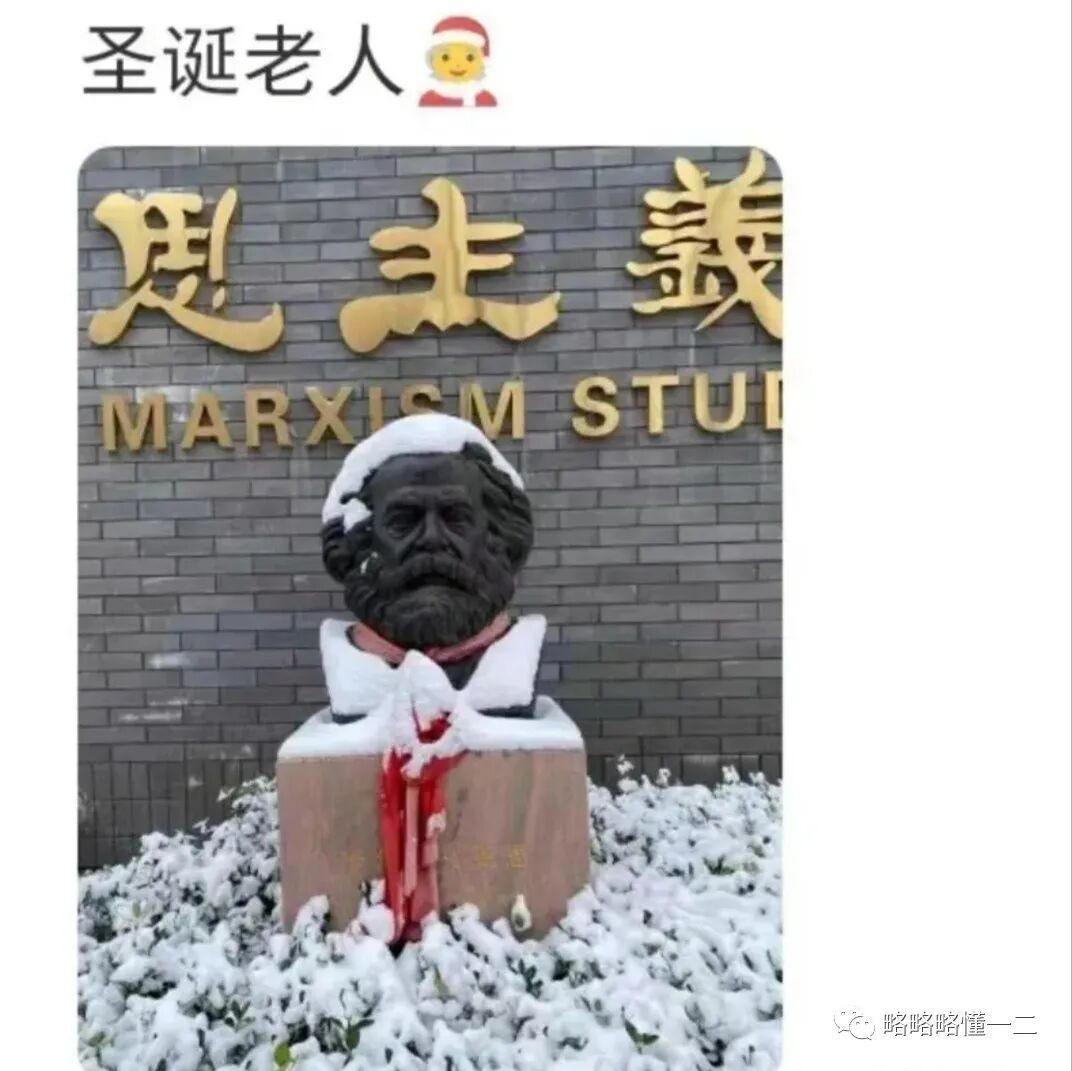 马克思雕塑直接变成了“圣诞老人”,毫无违和感,你别说马克思的头像和“圣诞老人”还真有一点像。估计都是大胡子的原因吧!