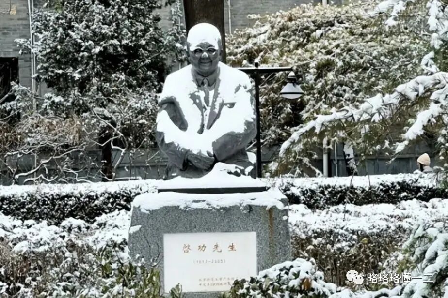 茅以升先生雕像上的雪也恰到好处,好像茅以升的身上穿了一件白色的毛衣,还戴着睡帽。