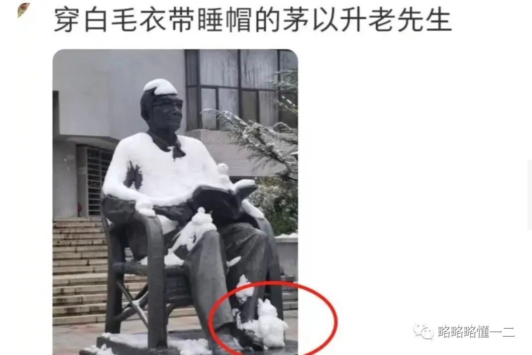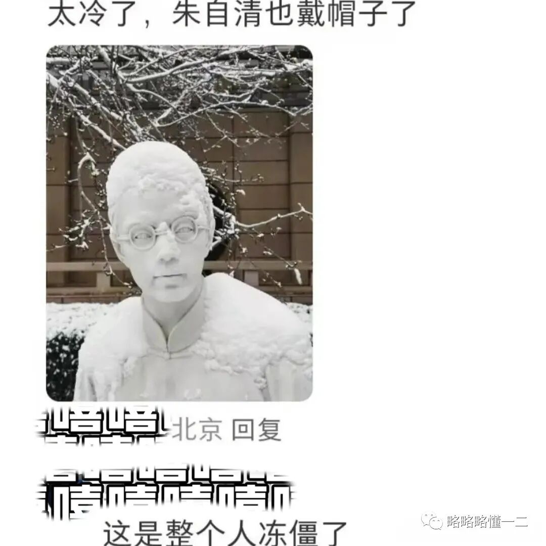 大学生们在校园里拍下照片,配文说:“太冷了,朱自清也戴帽子了”,与其说朱自清戴帽子,还不如说朱自清整个人都冻僵了,有一种加了冰冻特效的感觉,雕塑在冬天太难过了。
