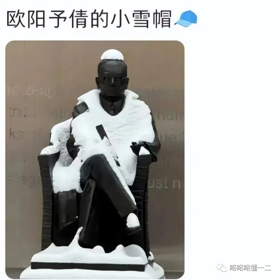 还有更搞笑的欧阳予倩的雕塑,欧阳予倩的头上好像戴了一个小雪帽,看起来有一点可爱。