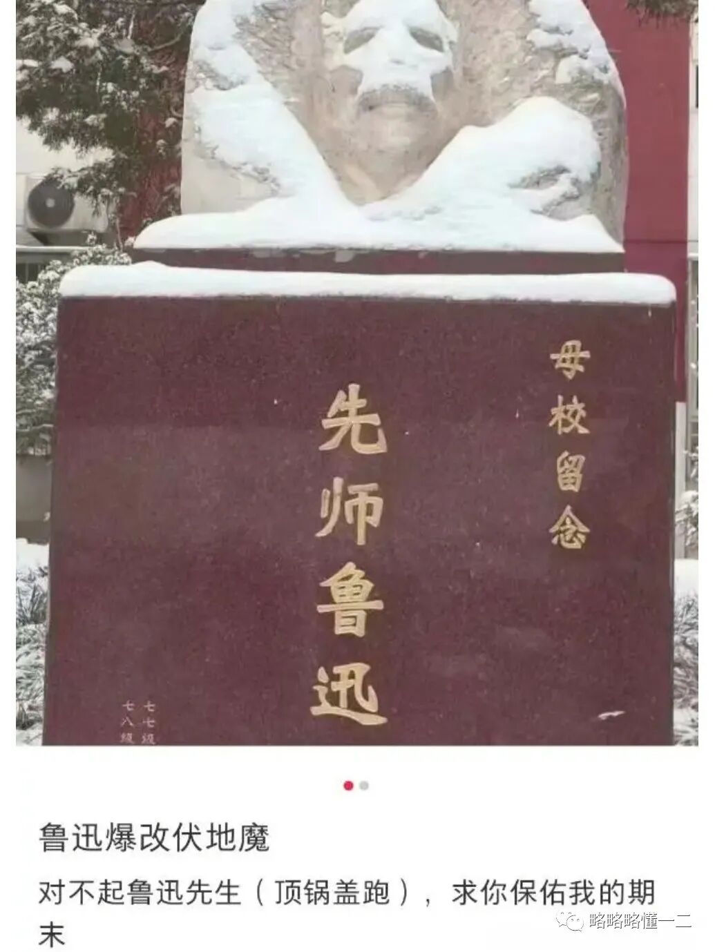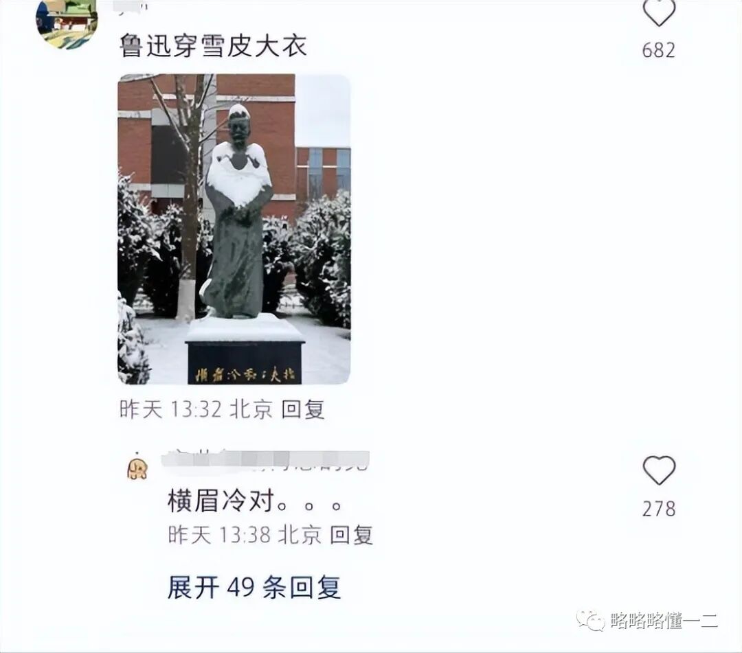 等下雪后的鲁迅雕塑完全看不出来原来的样子了,被学生称为“鲁迅爆改伏地魔”!