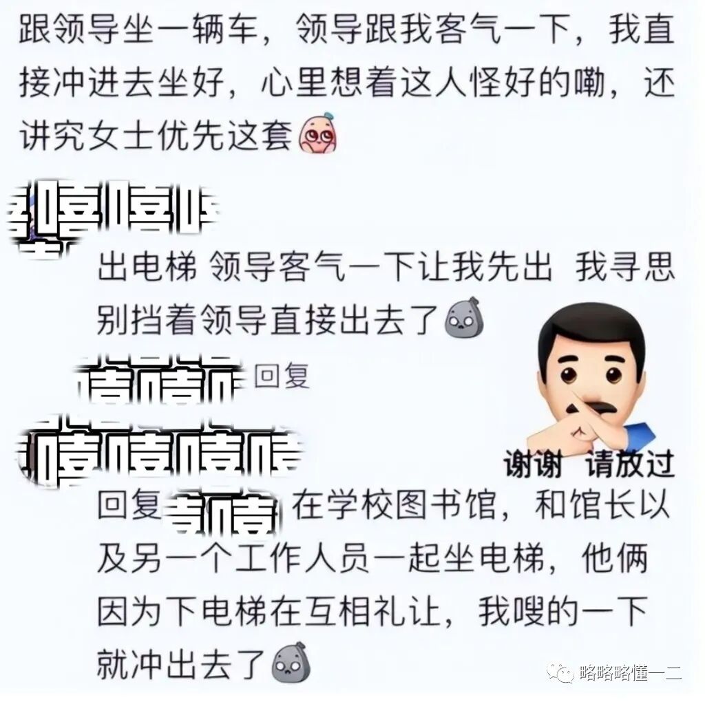 当然,大学生也有大学生的想法,和领导一起出电梯,领导就是客气一下让她先走,结果大学生心里想的是:我别挡着领导的道,于是先走了。