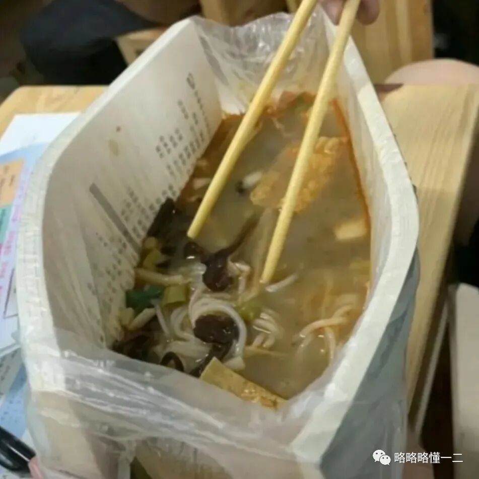 在外面打包一份螺蛳粉回来没有容器吃怎么办?这可难不倒大学生,用一本书翻开作为支撑,然后里面套一个塑料袋,就可以享受美味了。