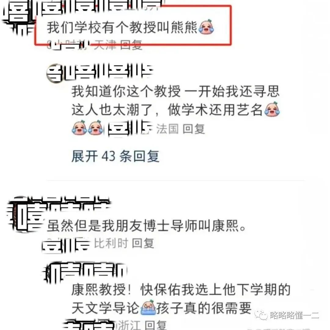 来自IP地址是天津的大学生说,自己学校有位教授叫“熊熊”,名字怪可爱的,在评论区里还发现了同样认识这名教授的人,网友说一开始觉得这个人还挺潮的,做学术还用艺名,没想到人家真的是叫“熊熊”。