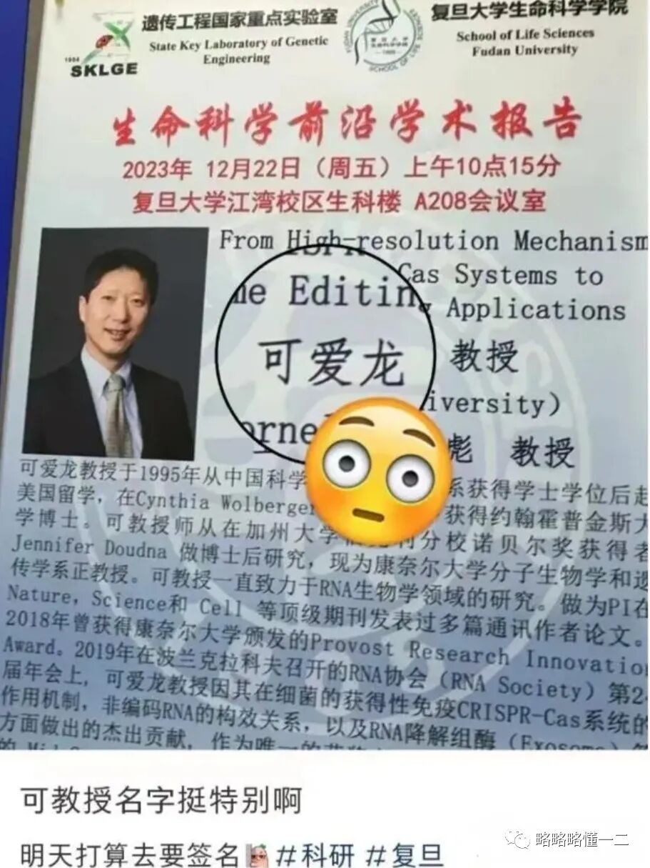 比如复旦大学生命科学学院的教授名字叫“可爱龙”,是复旦大学一位很牛的教授。