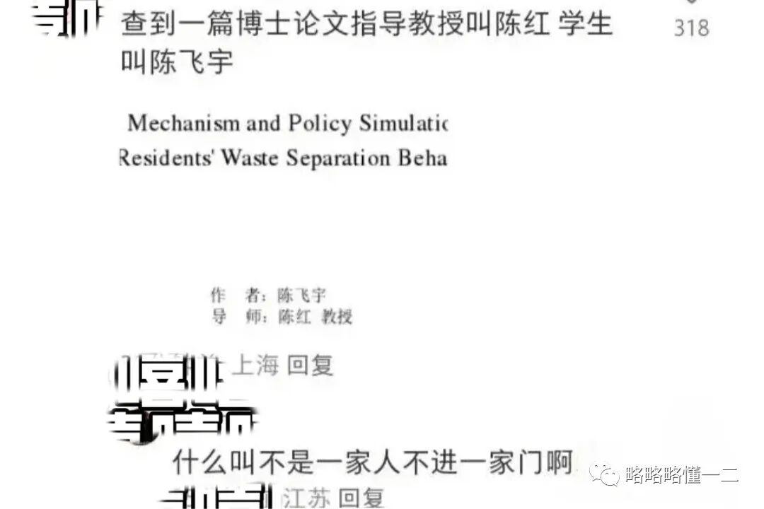 还有更巧合的事情,有一篇博士论文的学生名字叫陈飞宇,而他的指导教师名字叫陈红,让略略想起了那个明星家庭,原来真的是“不是一家人,不进一家门”。