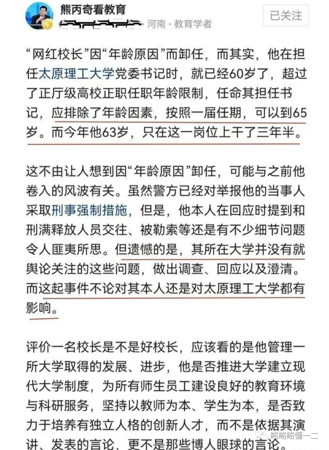 他认为评价一个校长的好坏,不应该是依据演讲或者是某些不实的博人眼球的言论,要看有没有让大学发展进步,为师生员工创造良好的条件,培养创新人才等,以年龄为理由让人离开,有些难以服众。