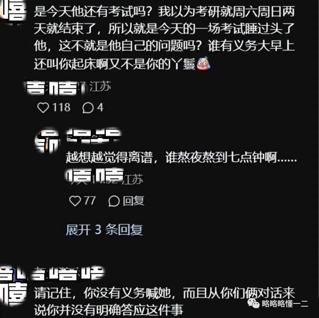 这位网友说早晨起床去考研,这不是自己的事情吗?自己考试没赶上又能够怪谁呢?谁有义务大早晨叫你起床呢?室友又不是你的丫鬟。