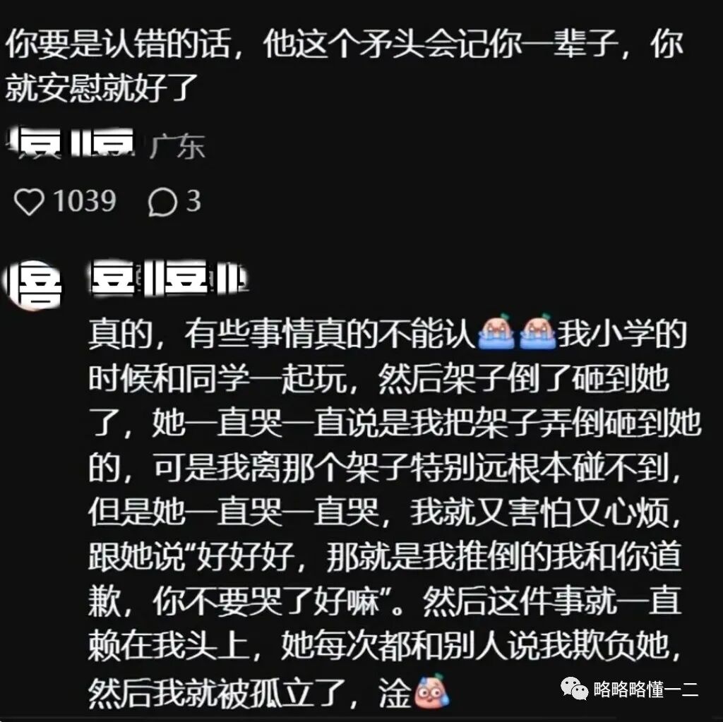 网友说小时候和同学一起玩,然后同学被架子给砸到了,同学就说是他弄倒后砸到她的,一直在苦恼,网友说他也有些不耐烦了,害怕又心急,就说了那个架子是我推倒的,我给你道歉,结果就被同学抓住了“把柄”,总是说网友欺负她。