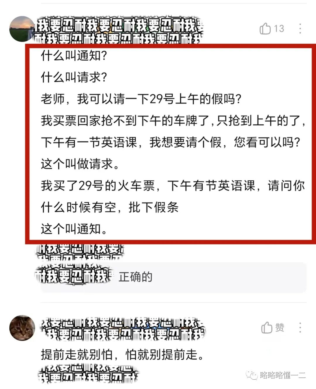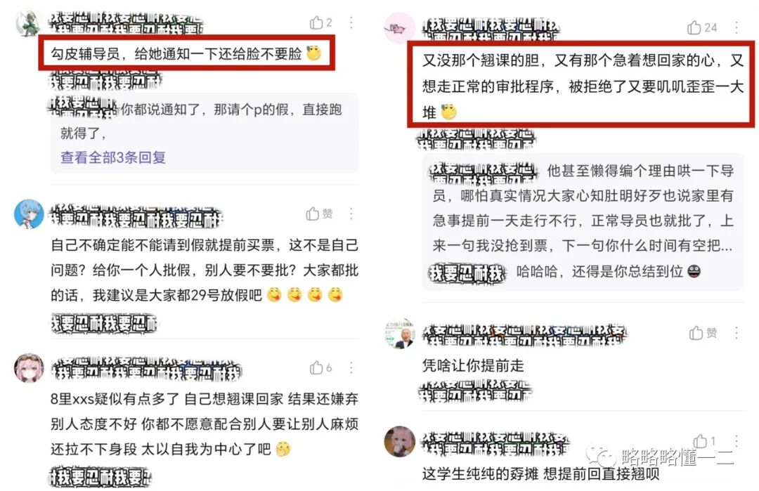 用其他同学的评论来讲就是,又没翘课的胆子,又想着提前回家,又想走正常请假流程,被拒绝了又叽叽歪歪一大堆。
