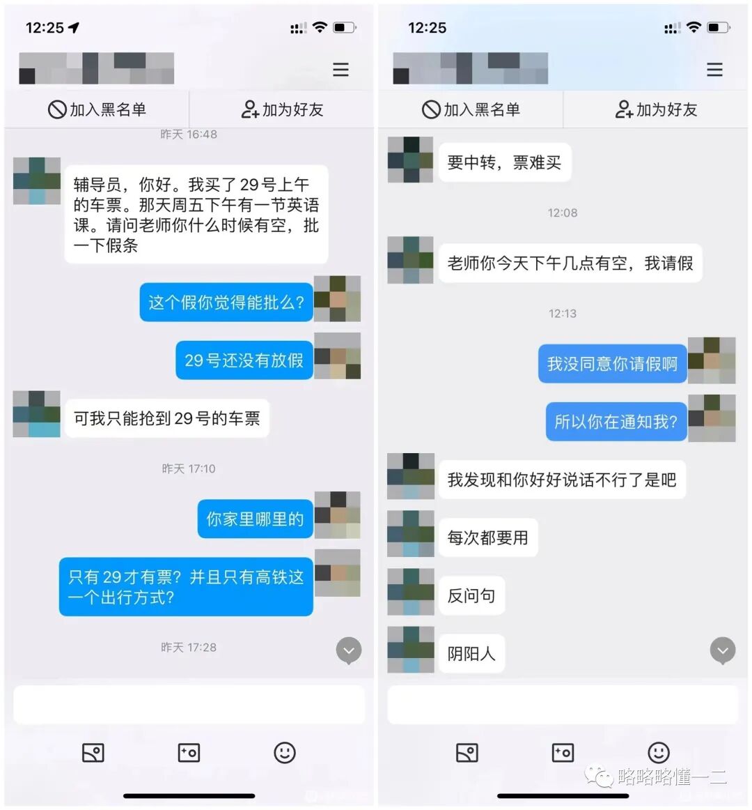 学生给的理由是,要中转,要抢票。然后到了第二天,学生再次找到辅导员批假,辅导员直接回复了,“我没同意你请假啊!所以你在通知我?”