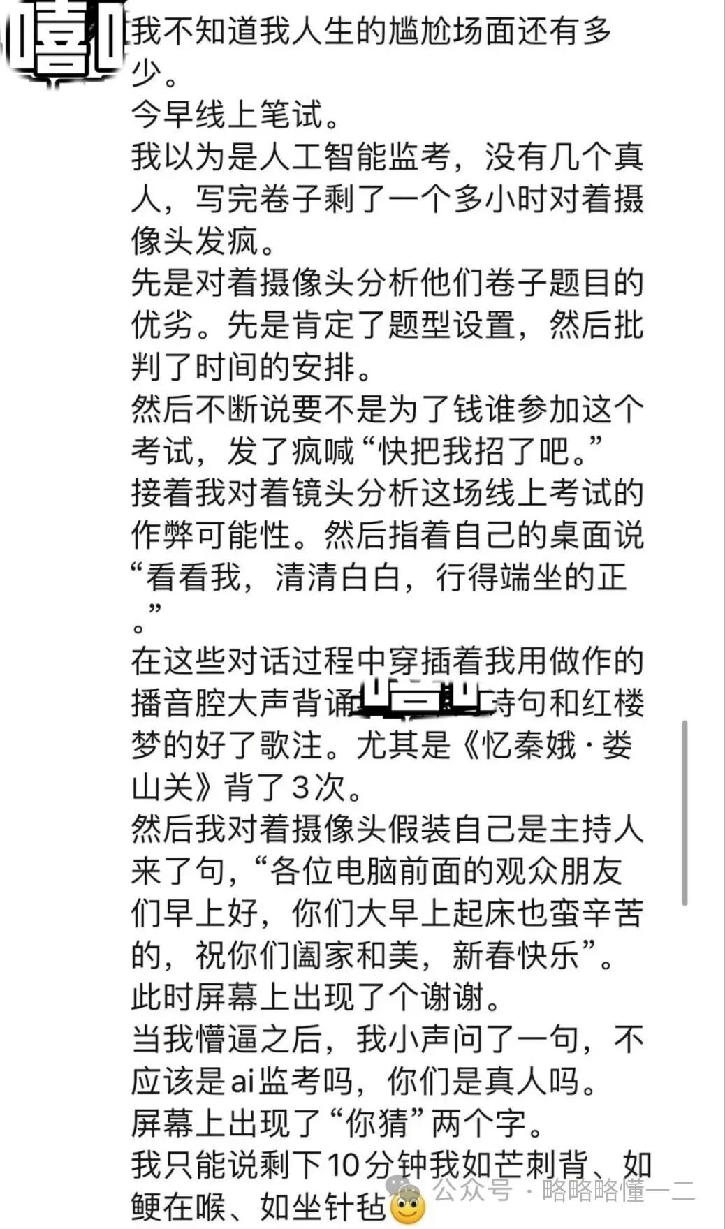 更离谱的是这名同学还分析上了线上考试作弊的可能性,然后自证清白,说自己的桌面干干净净,还用播音腔背诵,最后直接客串春晚主持人了,还说上了新年的祝福语。