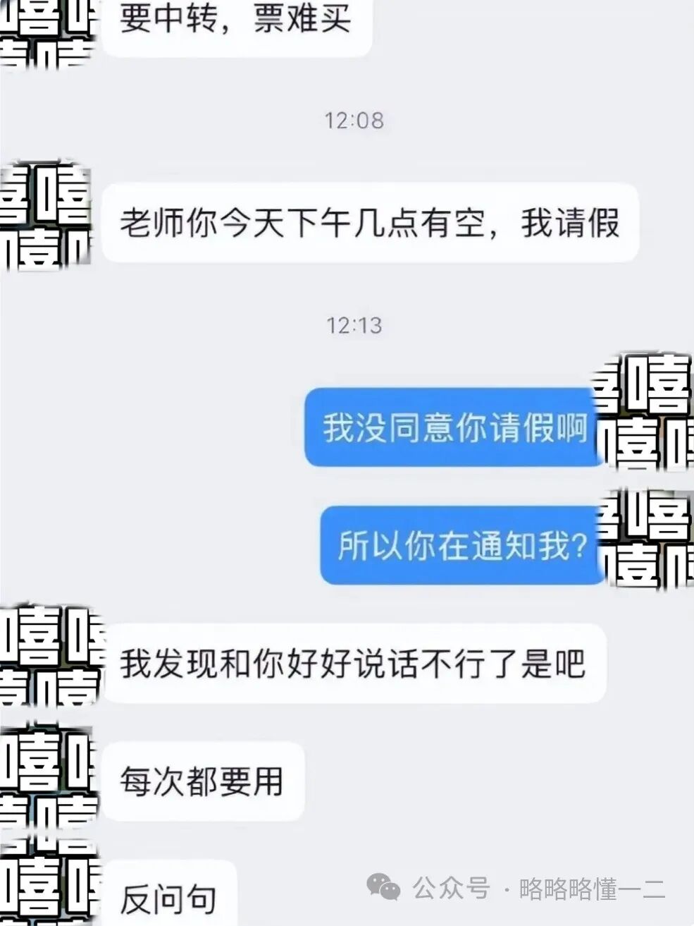 又过了一会,大学生问老师下午几点有空要请假,老师回复说自己没同意大学生请假啊,老师理解的大学生请假是通知,而不是请示。