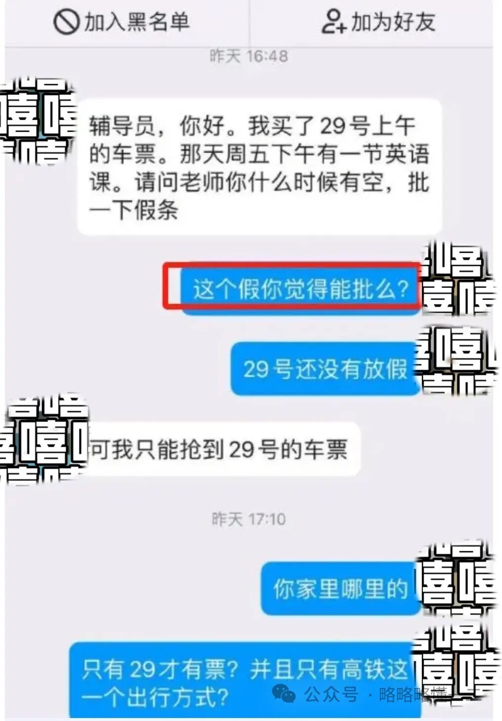 辅导员接着反问一句:“这个假你觉得能批吗?29号还没有放假”。大学生回复说自己只能买到29号的票,要中转票不好买,其间老师还问了大学生家在哪里?