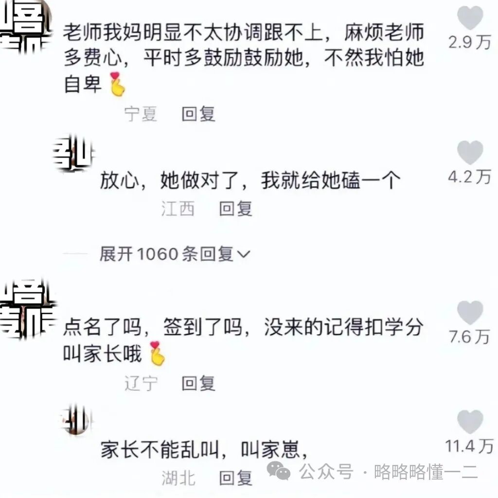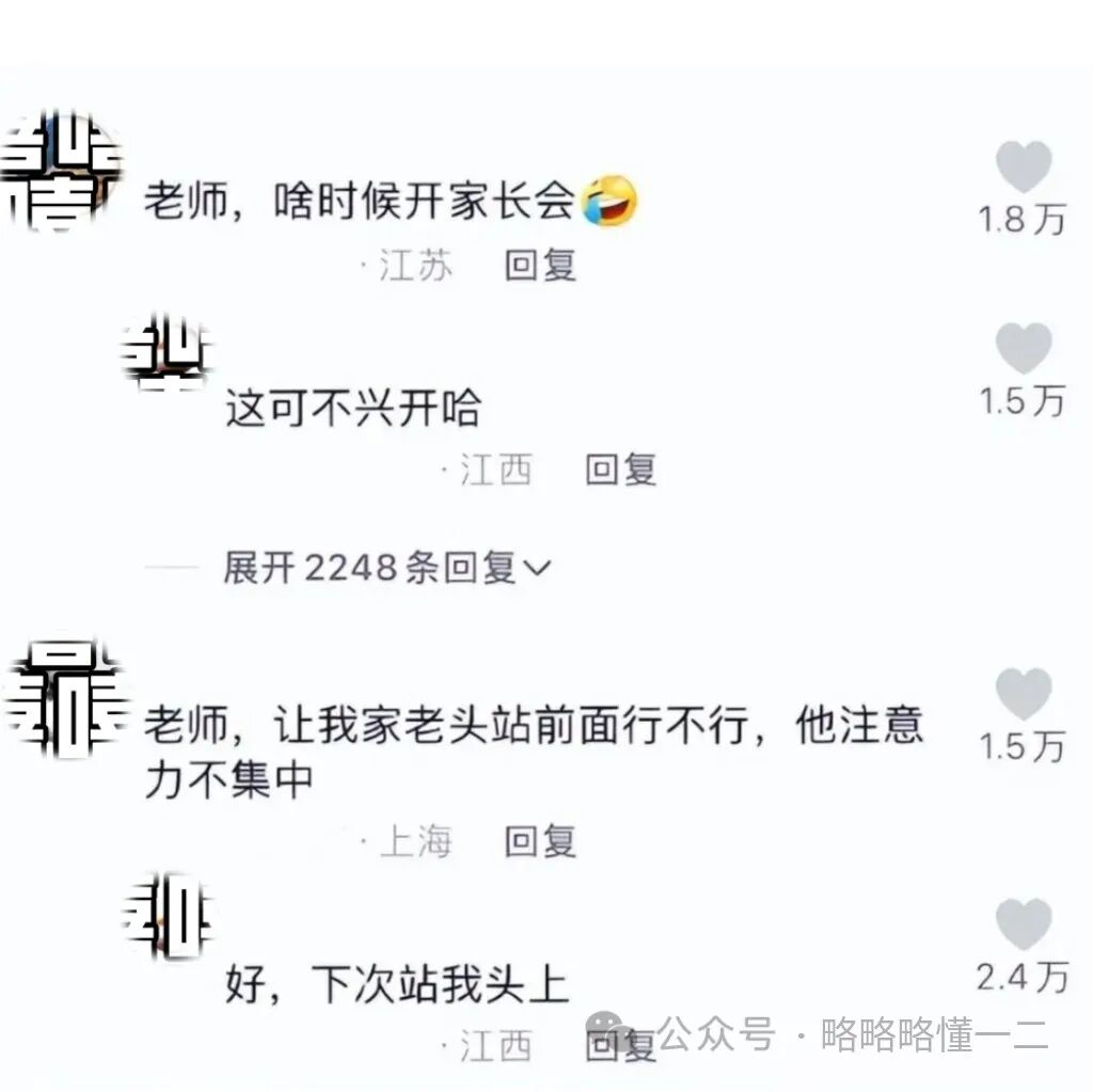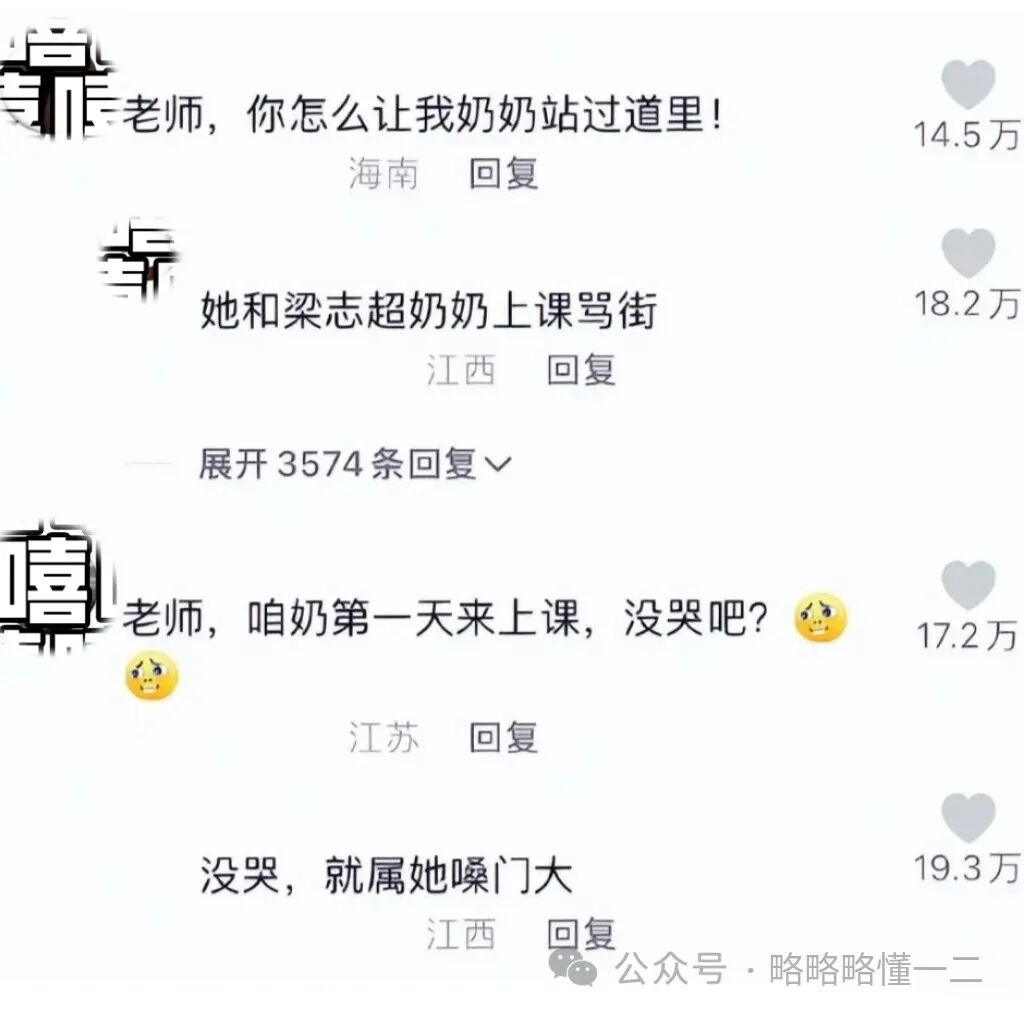 还有“家崽”质问老师说你怎么让我奶奶站在过道里,老师给出了回答,说和梁志超的奶奶上课骂街。