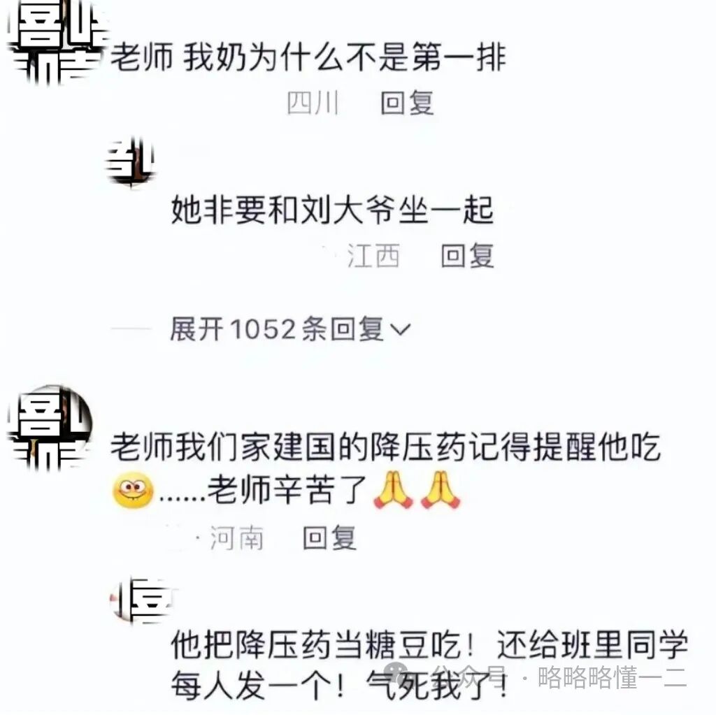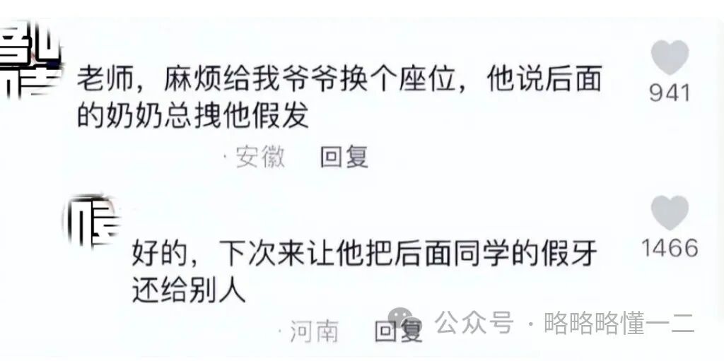 这些“老年学生”可能回家也告状,网友的爷爷说后面的奶奶总拽他假发,要换个座位。
